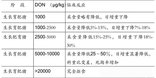 表3 日糧嘔吐毒素含量與豬臨床反應(yīng)