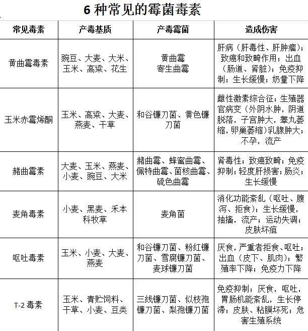 Several mycotoxins exists in feed ingredients and feed at the same time is a very common phenomenon, but the synergy between mycotoxin effects on animal health and production performance than the harm of any kind of mycotoxin separate function. There are 6 kinds of mycotoxins are the most common: aflatoxin, corn gibberellic ketene, ochratoxin, ergot toxin, vomiting toxins and T - 2 toxin.